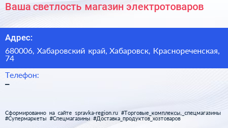 Ваша светлость, магазин электротоваров по адресу 680006, Хабаровский край, Хабаровск, Краснореченская, 74 в дальнейшем Организация, размещена в следующих категориях: