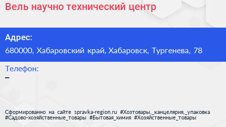 Вель, научно-технический центр по адресу 680000, Хабаровский край, Хабаровск, Тургенева, 78 в дальнейшем Организация, размещена в следующих категориях: