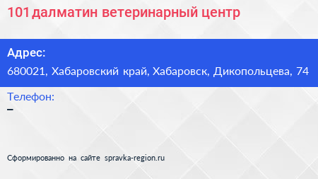 101 далматин, ветеринарный центр по адресу 680021, Хабаровский край, Хабаровск, Дикопольцева, 74 в дальнейшем Организация, размещена в следующих категориях: