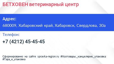 БЕТХОВЕН, ветеринарный центр по адресу 680009, Хабаровский край, Хабаровск, Свердлова, 30а в дальнейшем Организация, размещена в следующих категориях: