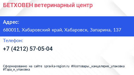БЕТХОВЕН, ветеринарный центр по адресу 680011, Хабаровский край, Хабаровск, Запарина, 137 в дальнейшем Организация, размещена в следующих категориях:
