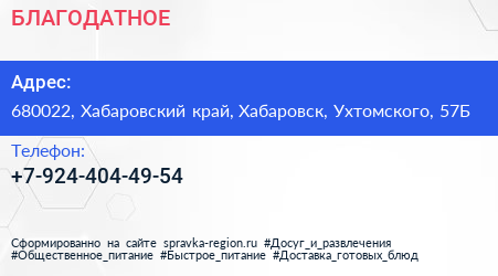 БЛАГОДАТНОЕ по адресу 680022, Хабаровский край, Хабаровск, Ухтомского, 57Б в дальнейшем Организация, размещена в следующих категориях: