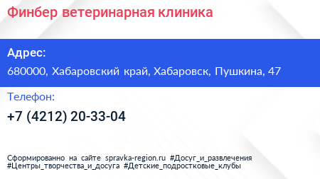 Финбер, ветеринарная клиника по адресу 680000, Хабаровский край, Хабаровск, Пушкина, 47 в дальнейшем Организация, размещена в следующих категориях:
