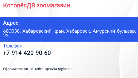 КотопёсДВ, зоомагазин по адресу 680038, Хабаровский край, Хабаровск, Амурский бульвар, 23 в дальнейшем Организация, размещена в следующих категориях: