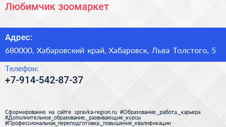 Любимчик, зоомаркет по адресу 680000, Хабаровский край, Хабаровск, Льва Толстого, 5 в дальнейшем Организация, размещена в следующих категориях: