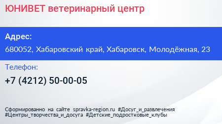 ЮНИВЕТ, ветеринарный центр по адресу 680052, Хабаровский край, Хабаровск, Молодёжная, 23 в дальнейшем Организация, размещена в следующих категориях:
