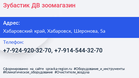 Зубастик-ДВ, зоомагазин по адресу Хабаровский край, Хабаровск, Шеронова, 5а в дальнейшем Организация, размещена в следующих категориях: