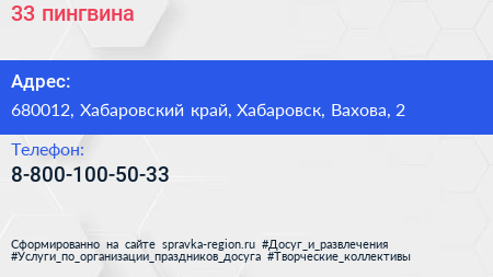 33 пингвина по адресу 680012, Хабаровский край, Хабаровск, Вахова, 2 в дальнейшем Организация, размещена в следующих категориях: