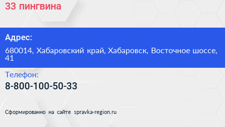 33 пингвина по адресу 680014, Хабаровский край, Хабаровск, Восточное шоссе, 41 в дальнейшем Организация, размещена в следующих категориях: