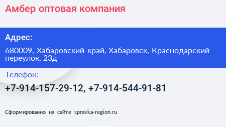 Амбер, оптовая компания по адресу 680009, Хабаровский край, Хабаровск, Краснодарский переулок, 23д в дальнейшем Организация, размещена в следующих категориях: