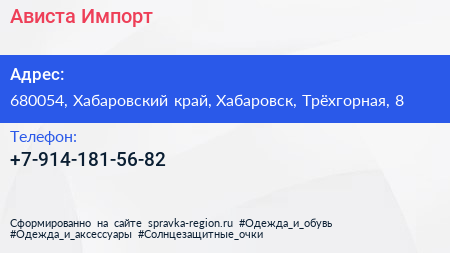 Ависта Импорт по адресу 680054, Хабаровский край, Хабаровск, Трёхгорная, 8 в дальнейшем Организация, размещена в следующих категориях: