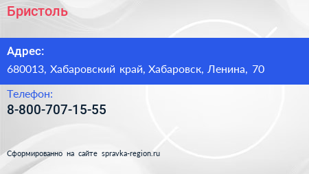 Бристоль по адресу 680013, Хабаровский край, Хабаровск, Ленина, 70 в дальнейшем Организация, размещена в следующих категориях:
