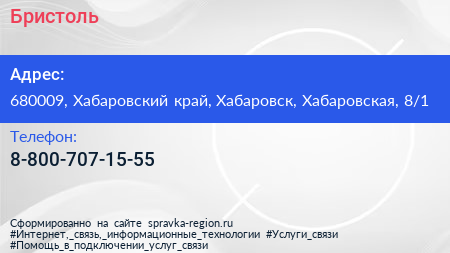 Бристоль по адресу 680009, Хабаровский край, Хабаровск, Хабаровская, 8/1 в дальнейшем Организация, размещена в следующих категориях: