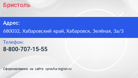 Бристоль по адресу 680032, Хабаровский край, Хабаровск, Зелёная, 3а/3 в дальнейшем Организация, размещена в следующих категориях: