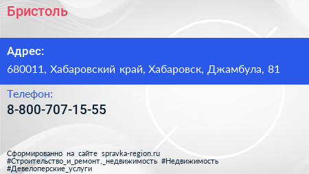 Бристоль по адресу 680011, Хабаровский край, Хабаровск, Джамбула, 81 в дальнейшем Организация, размещена в следующих категориях: