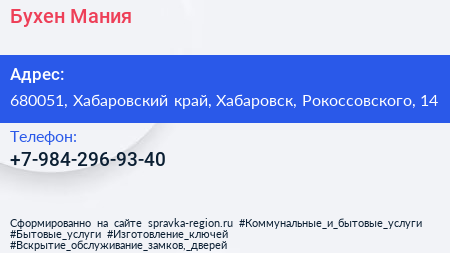 Бухен-Мания по адресу 680051, Хабаровский край, Хабаровск, Рокоссовского, 14 в дальнейшем Организация, размещена в следующих категориях: