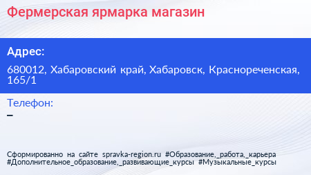Фермерская ярмарка, магазин по адресу 680012, Хабаровский край, Хабаровск, Краснореченская, 165/1 в дальнейшем Организация, размещена в следующих категориях: