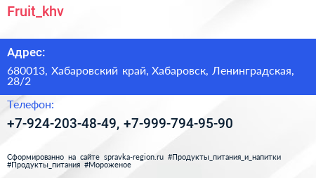 Fruit_khv по адресу 680013, Хабаровский край, Хабаровск, Ленинградская, 28/2 в дальнейшем Организация, размещена в следующих категориях: