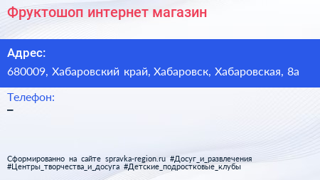 Фруктошоп, интернет-магазин по адресу 680009, Хабаровский край, Хабаровск, Хабаровская, 8а в дальнейшем Организация, размещена в следующих категориях: