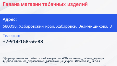 Гавана, магазин табачных изделий по адресу 680038, Хабаровский край, Хабаровск, Знаменщикова, 3 в дальнейшем Организация, размещена в следующих категориях: