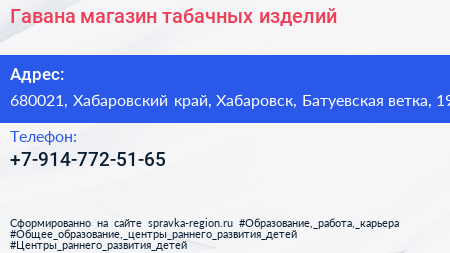 Гавана, магазин табачных изделий по адресу 680021, Хабаровский край, Хабаровск, Батуевская ветка, 19 в дальнейшем Организация, размещена в следующих категориях: