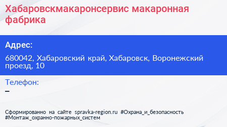 Хабаровскмакаронсервис, макаронная фабрика по адресу 680042, Хабаровский край, Хабаровск, Воронежский проезд, 10 в дальнейшем Организация, размещена в следующих категориях: