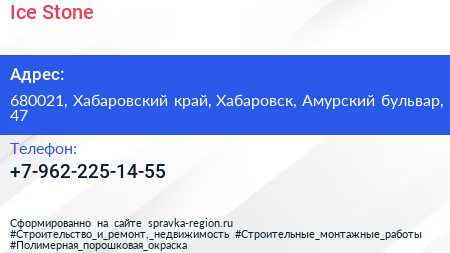 Ice Stone по адресу 680021, Хабаровский край, Хабаровск, Амурский бульвар, 47 в дальнейшем Организация, размещена в следующих категориях: