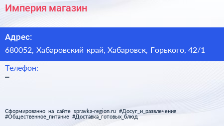 Империя, магазин по адресу 680052, Хабаровский край, Хабаровск, Горького, 42/1 в дальнейшем Организация, размещена в следующих категориях: