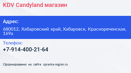 KDV Candyland, магазин по адресу 680012, Хабаровский край, Хабаровск, Краснореченская, 169а в дальнейшем Организация, размещена в следующих категориях: