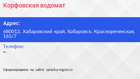 Корфовская, водомат по адресу 680012, Хабаровский край, Хабаровск, Краснореченская, 165/7 в дальнейшем Организация, размещена в следующих категориях: