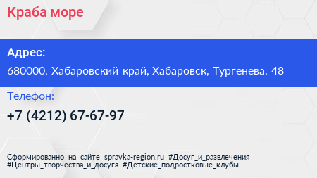 Краба море по адресу 680000, Хабаровский край, Хабаровск, Тургенева, 48 в дальнейшем Организация, размещена в следующих категориях: