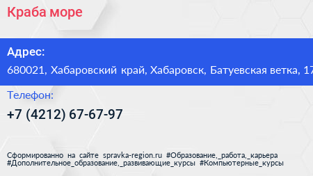Краба море по адресу 680021, Хабаровский край, Хабаровск, Батуевская ветка, 17 в дальнейшем Организация, размещена в следующих категориях: