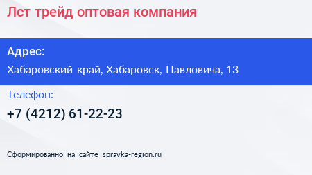 Лст-трейд, оптовая компания по адресу Хабаровский край, Хабаровск, Павловича, 13 в дальнейшем Организация, размещена в следующих категориях: