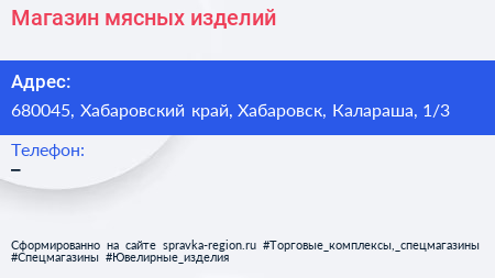 Магазин мясных изделий по адресу 680045, Хабаровский край, Хабаровск, Калараша, 1/3 в дальнейшем Организация, размещена в следующих категориях: