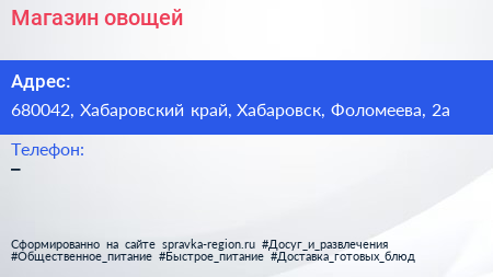 Магазин овощей по адресу 680042, Хабаровский край, Хабаровск, Фоломеева, 2а в дальнейшем Организация, размещена в следующих категориях: