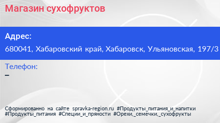 Магазин сухофруктов по адресу 680041, Хабаровский край, Хабаровск, Ульяновская, 197/3 в дальнейшем Организация, размещена в следующих категориях: