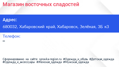 Магазин восточных сладостей по адресу 680032, Хабаровский край, Хабаровск, Зелёная, 3Б к3 в дальнейшем Организация, размещена в следующих категориях:
