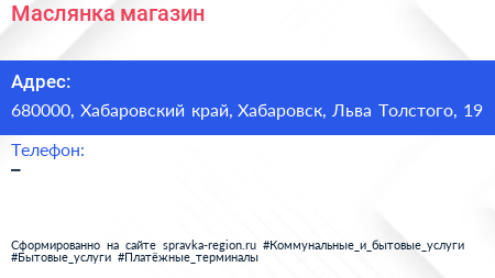 Маслянка, магазин по адресу 680000, Хабаровский край, Хабаровск, Льва Толстого, 19 в дальнейшем Организация, размещена в следующих категориях: