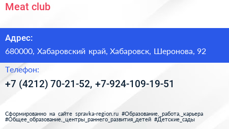 Meat club по адресу 680000, Хабаровский край, Хабаровск, Шеронова, 92 в дальнейшем Организация, размещена в следующих категориях: