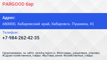 PARGOOD, бар по адресу 680000, Хабаровский край, Хабаровск, Пушкина, 41 в дальнейшем Организация, размещена в следующих категориях: