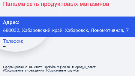 Пальма, сеть продуктовых магазинов по адресу 680032, Хабаровский край, Хабаровск, Локомотивная, 7 в дальнейшем Организация, размещена в следующих категориях: