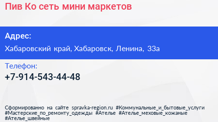 Пив & Ко, сеть мини-маркетов по адресу Хабаровский край, Хабаровск, Ленина, 33а в дальнейшем Организация, размещена в следующих категориях: