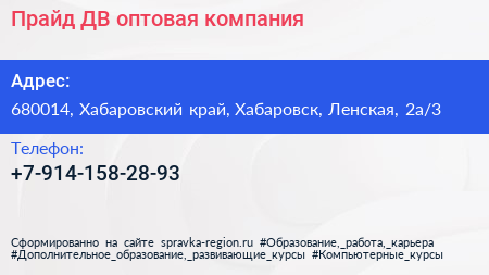 Прайд ДВ, оптовая компания по адресу 680014, Хабаровский край, Хабаровск, Ленская, 2а/3 в дальнейшем Организация, размещена в следующих категориях: