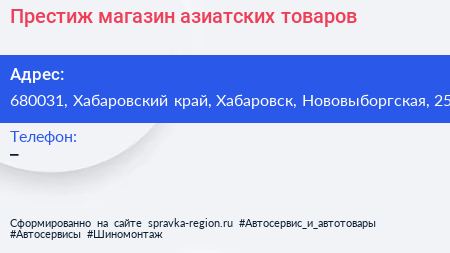 Престиж, магазин азиатских товаров по адресу 680031, Хабаровский край, Хабаровск, Нововыборгская, 25 в дальнейшем Организация, размещена в следующих категориях: