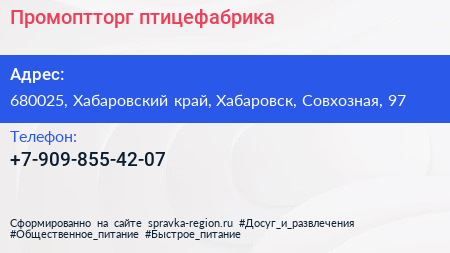 Промоптторг, птицефабрика по адресу 680025, Хабаровский край, Хабаровск, Совхозная, 97 в дальнейшем Организация, размещена в следующих категориях: