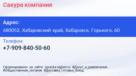 Сакура, компания по адресу 680052, Хабаровский край, Хабаровск, Горького, 60 в дальнейшем Организация, размещена в следующих категориях: