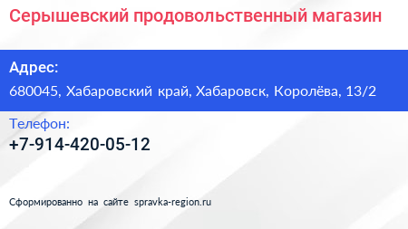 Серышевский, продовольственный магазин по адресу 680045, Хабаровский край, Хабаровск, Королёва, 13/2 в дальнейшем Организация, размещена в следующих категориях: