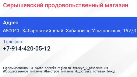 Серышевский, продовольственный магазин по адресу 680041, Хабаровский край, Хабаровск, Ульяновская, 197/3 в дальнейшем Организация, размещена в следующих категориях: