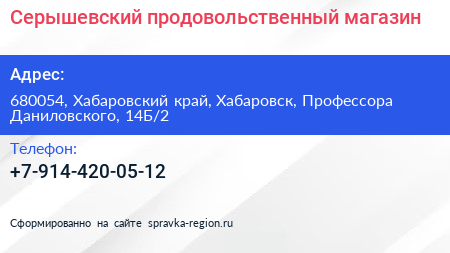 Серышевский, продовольственный магазин по адресу 680054, Хабаровский край, Хабаровск, Профессора Даниловского, 14Б/2 в дальнейшем Организация, размещена в следующих категориях: