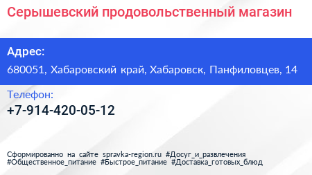 Серышевский, продовольственный магазин по адресу 680051, Хабаровский край, Хабаровск, Панфиловцев, 14 в дальнейшем Организация, размещена в следующих категориях: